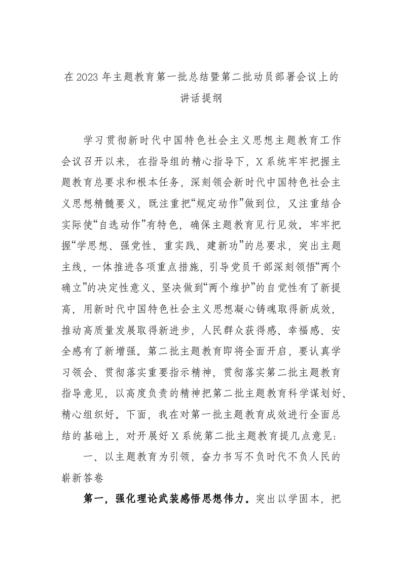 / 在2023年主题教育第一批总结暨第二批动员部署会议上的讲话提纲