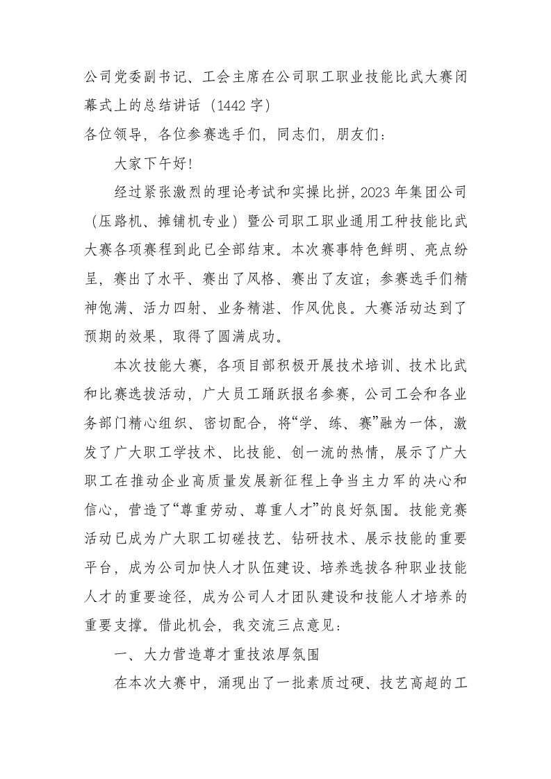 / 国企职工职业技能比武大赛闭幕式上的总结讲话