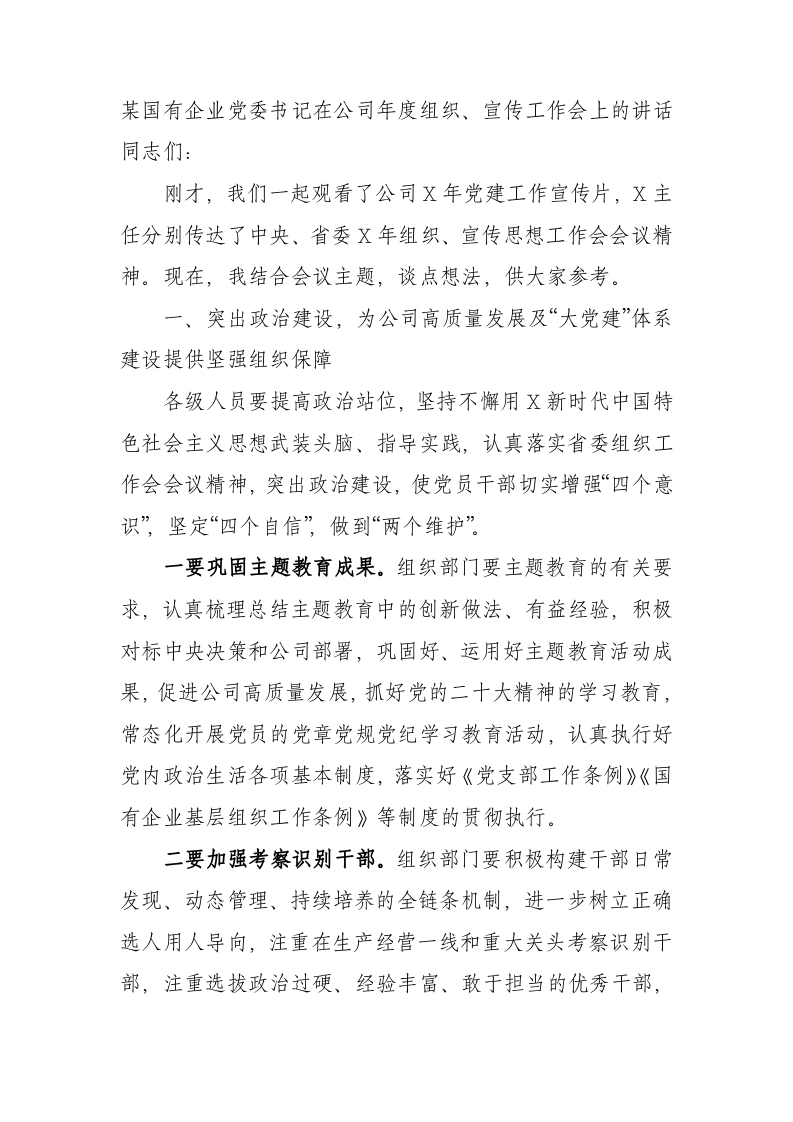 / 某国有企业党委书记在公司年度组织、宣传工作会上的讲话