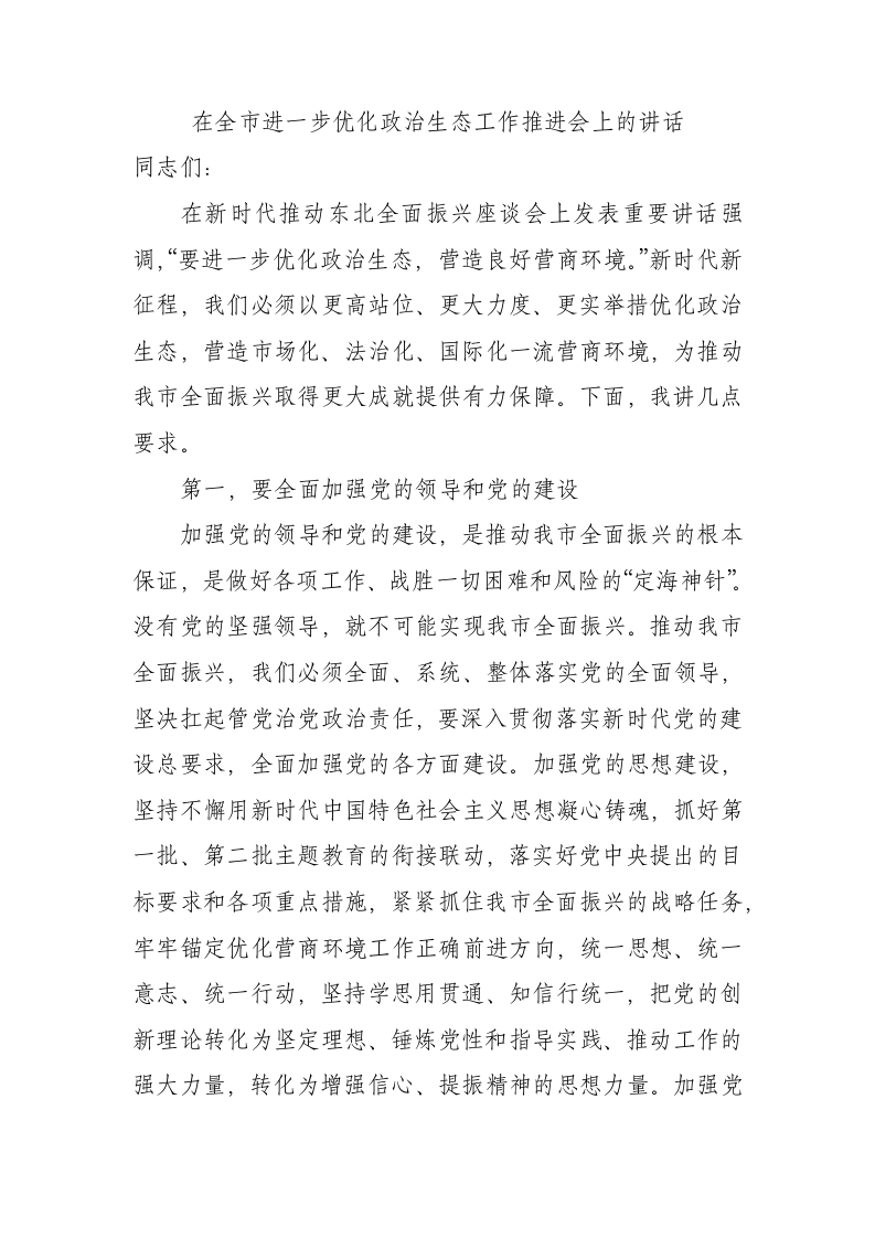 / 在全市进一步优化政治生态工作推进会上的讲话