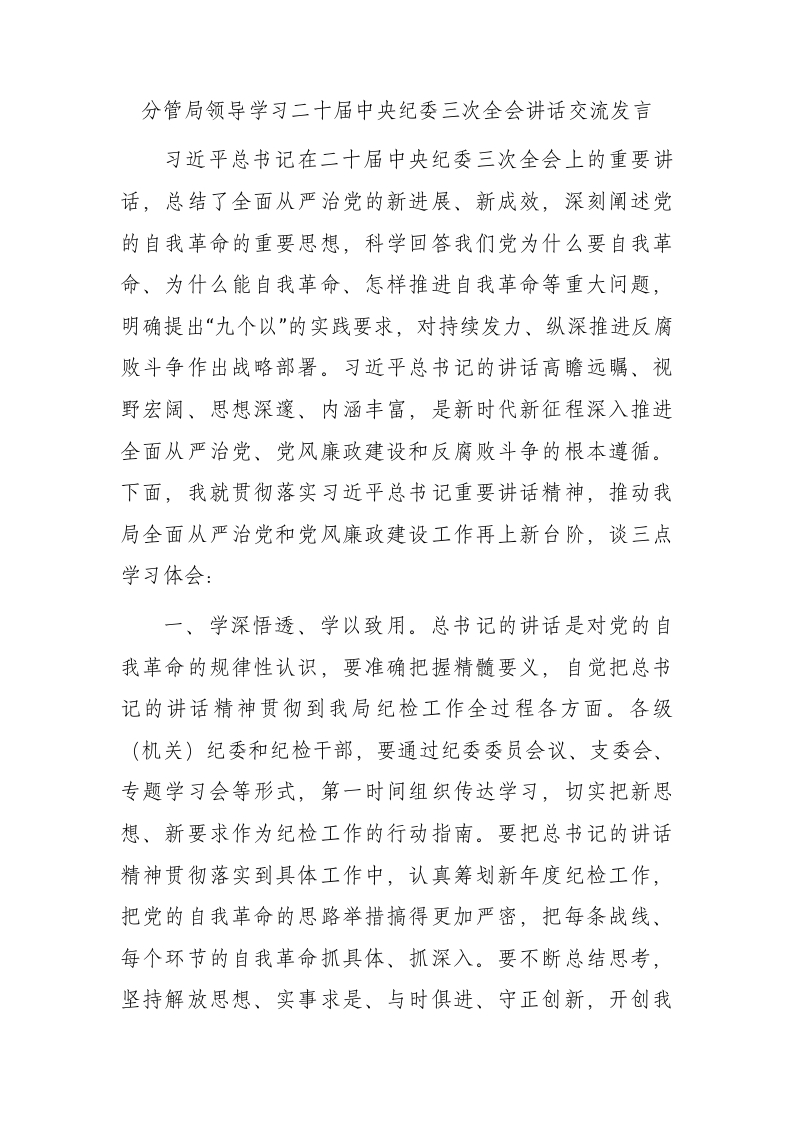 / 分管局领导学习纪委三次全会讲话交流发言