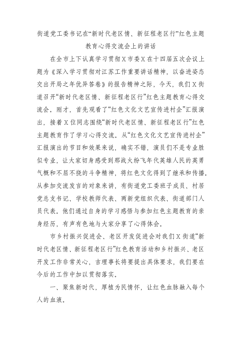 / 街道党工委书记在“新时代老区情、新征程老区行”红色主题教育心得交流会上的讲话