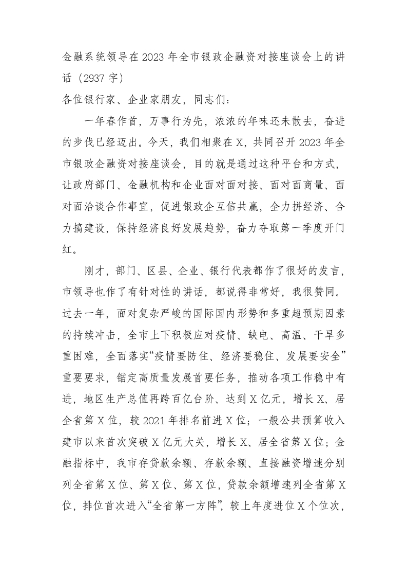 / 金融系统领导在2023年全市银政企融资对接座谈会上的讲话