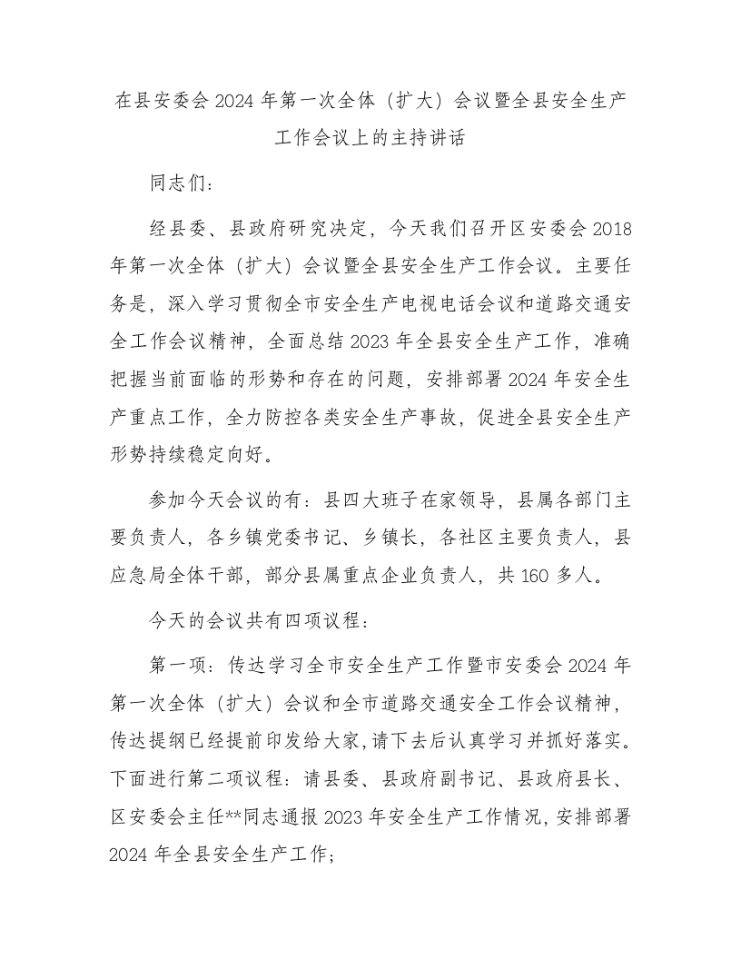 在县安委会2024年第一次全体(扩大)会议暨全县安全生产工作会议上的主持讲话