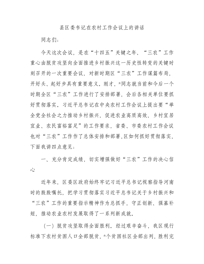/ 县区委书记在农村工作会议上的讲话