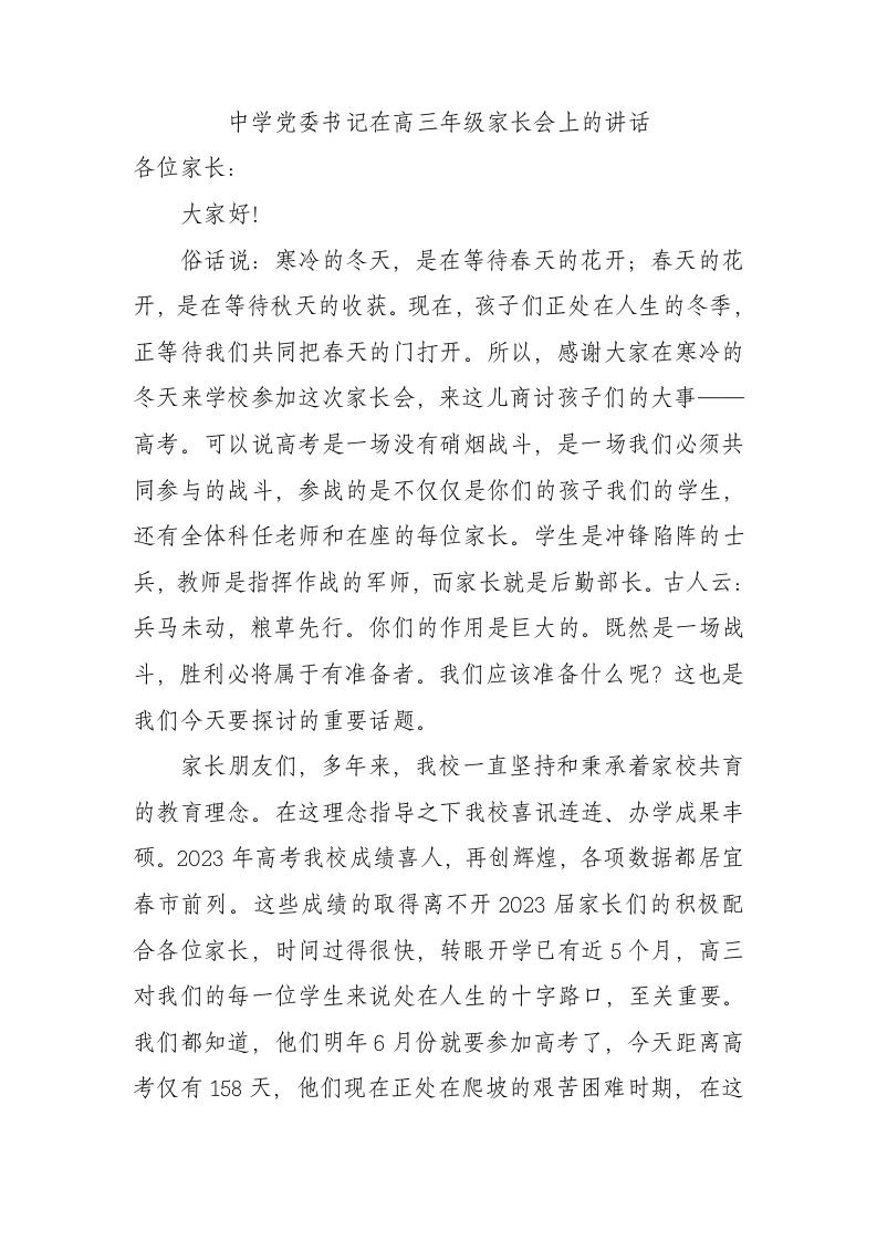 / 中学党委书记在高三年级家长会上的讲话