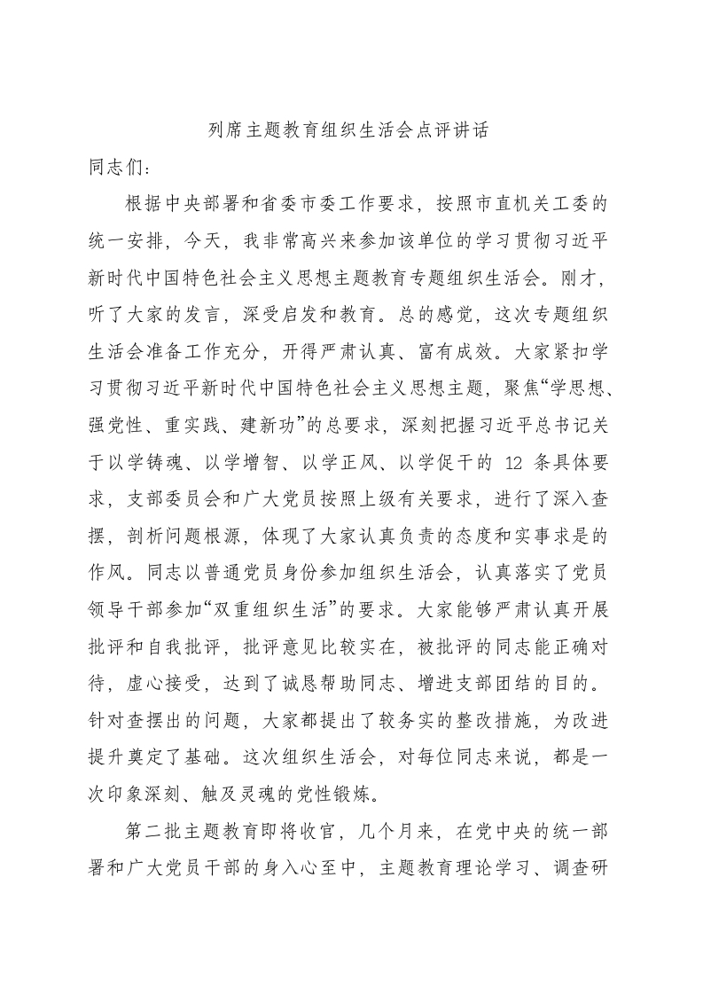 / (会中)列席主题教育组织生活会点评讲话