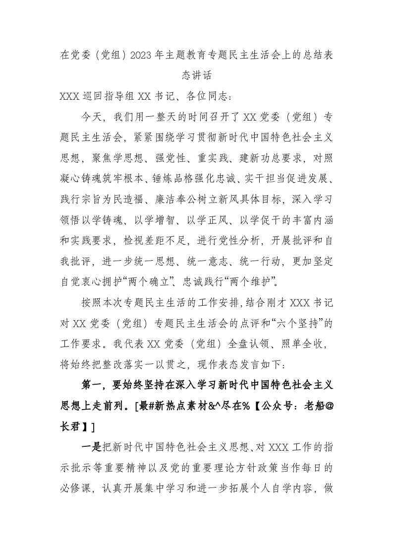 / 在党委(党组)2023年主题教育专题民主生活会上的总结表态讲话