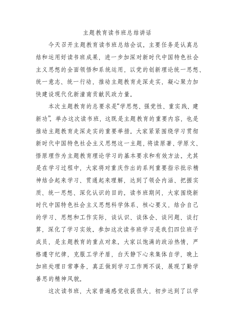 主题教育读书班总结讲话提纲