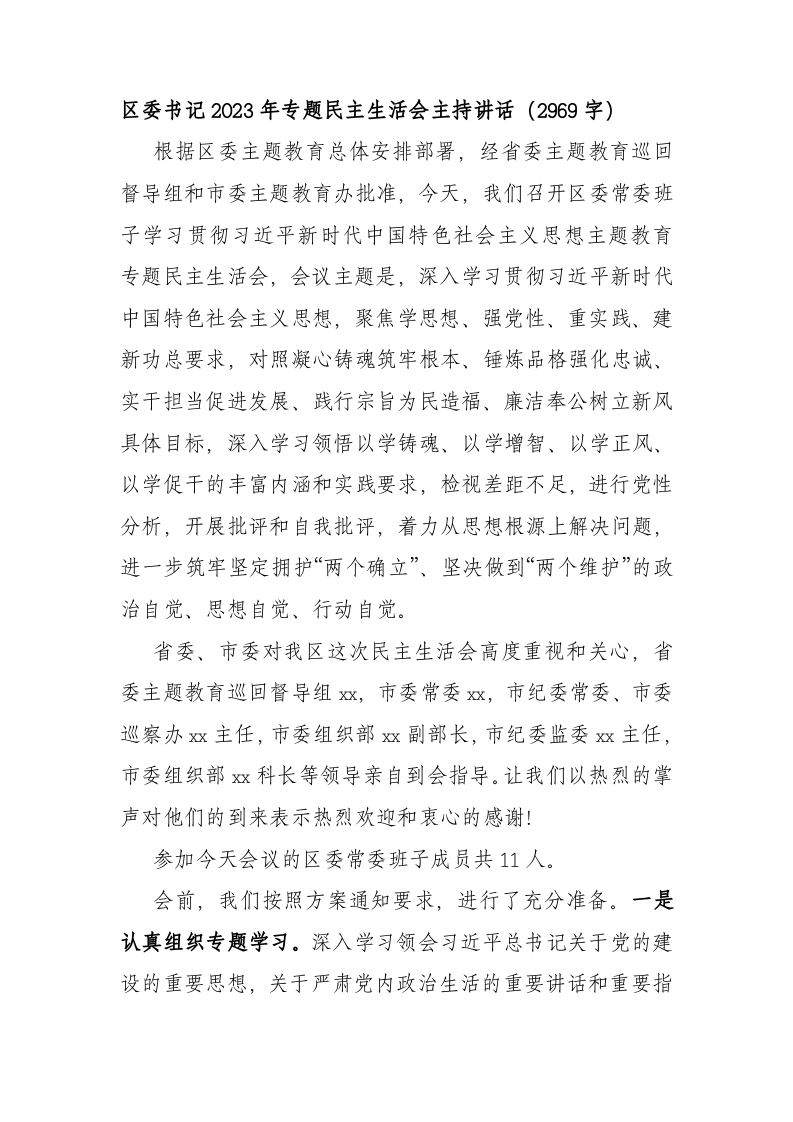 / (会中)区委书记2023年专题民主生活会主持讲话