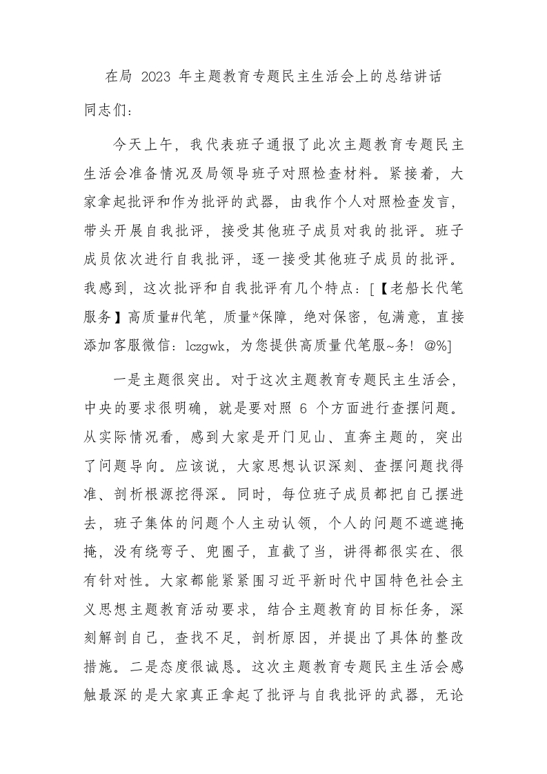 / (会中)在局2023年主题教育专题民主生活会上的总结讲话1700字