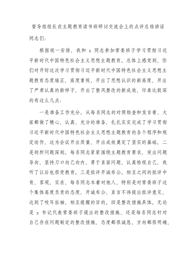 / 督导组组长在主题教育读书班研讨交流会上的点评总结讲话1600字