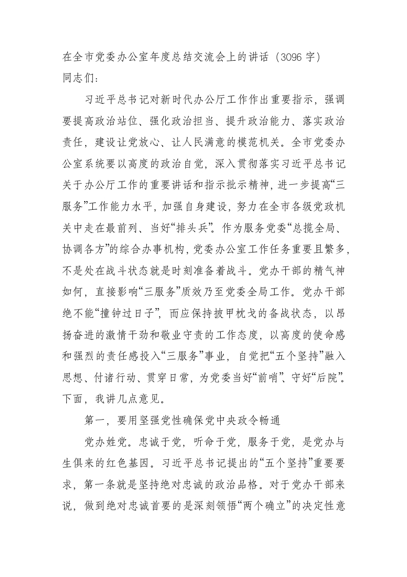 / 在全市党委办公室年度总结交流会上的讲话