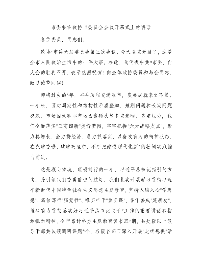 市委书在政协市委员会会议开幕式上的讲话