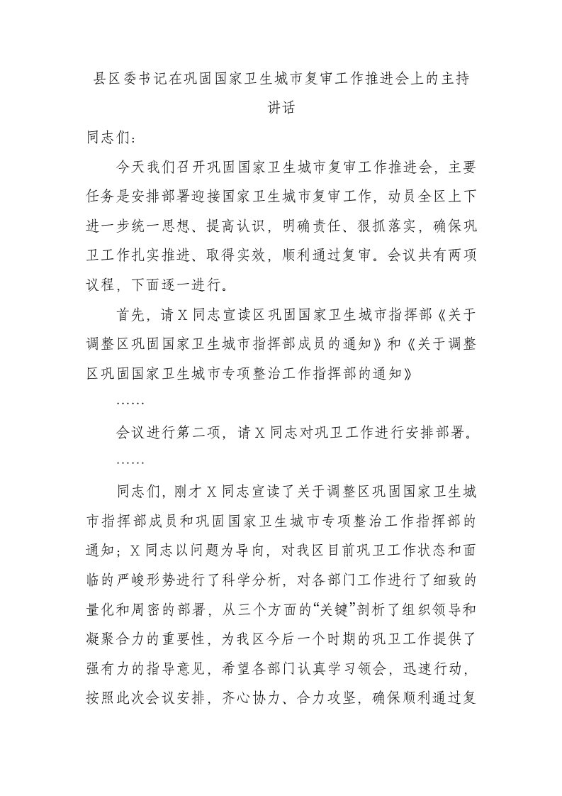 / 县区委书记在巩固国家卫生城市复审工作推进会上的主持讲话 (1)