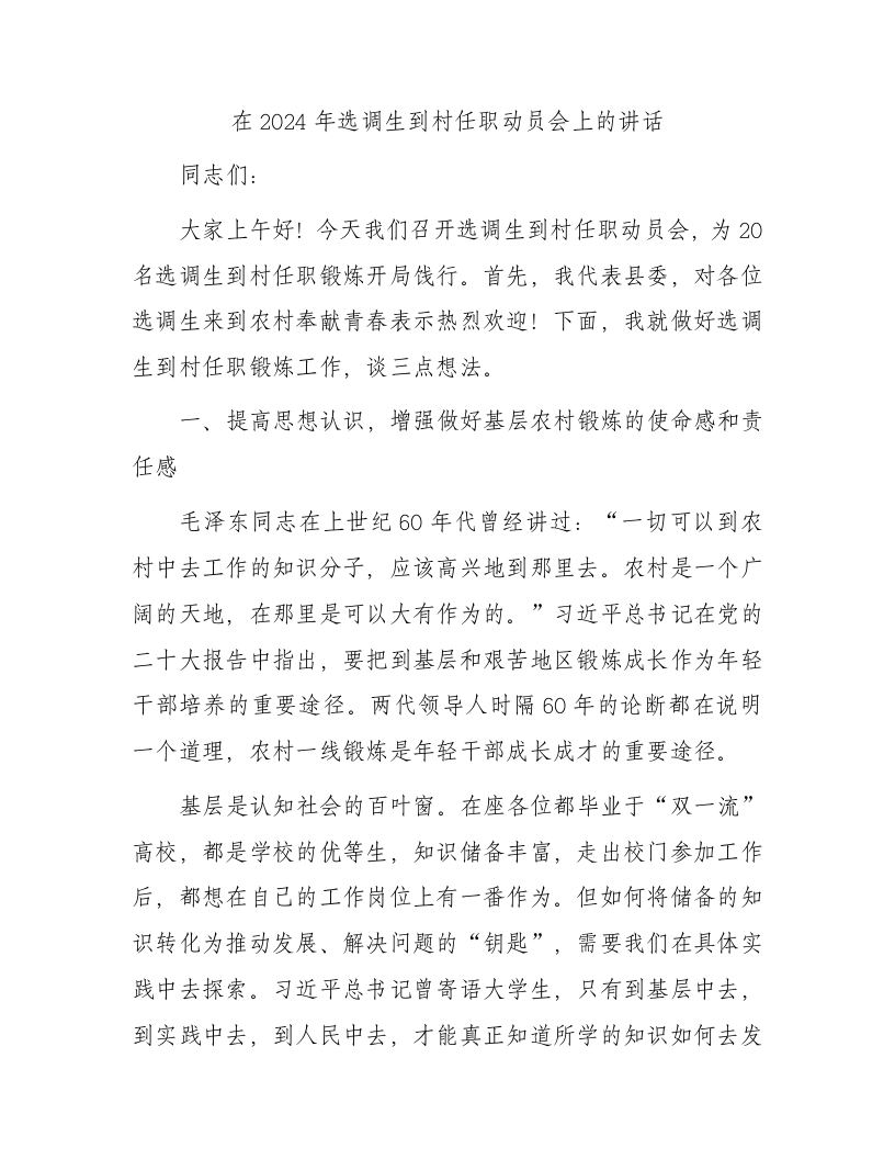 / 在2024年选调生到村任职动员会上的讲话