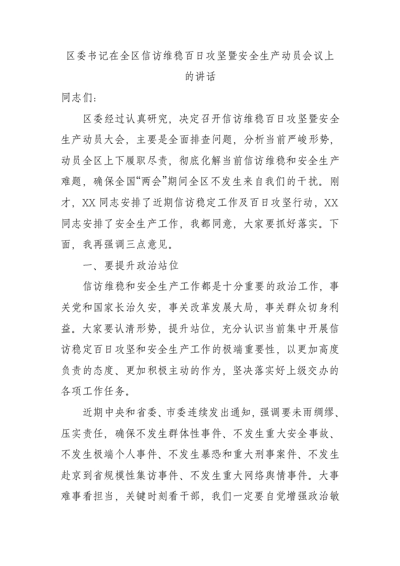 / 区委书记在全区信访维稳百日攻坚暨安全生产动员会议上的讲话 (1)