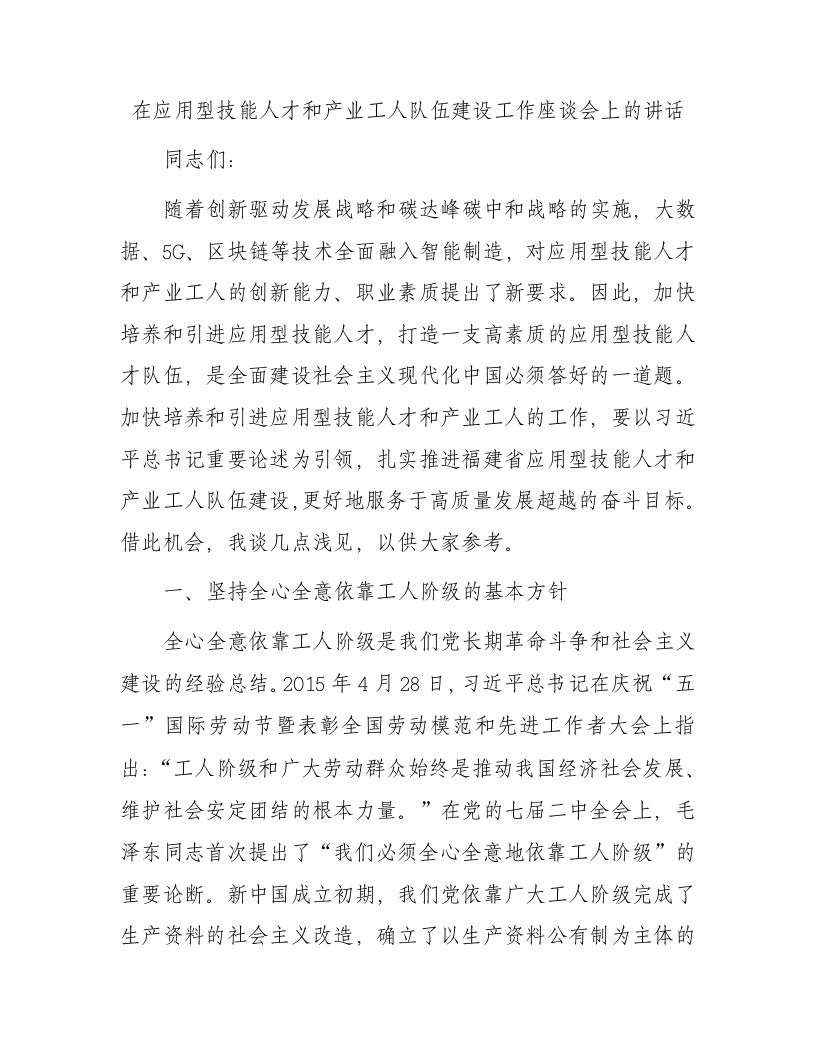 在应用型技能人才和产业工人队伍建设工作座谈会上的讲话