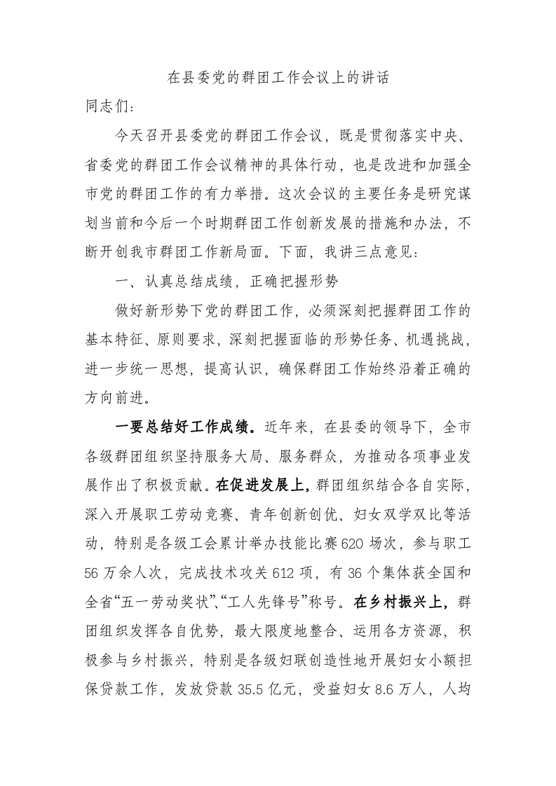 / XX在县委党的群团工作会议上的讲话