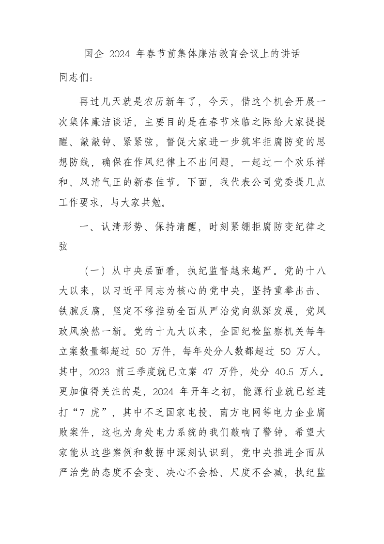 / 国企2024年春节前集体廉洁教育会议上的讲话