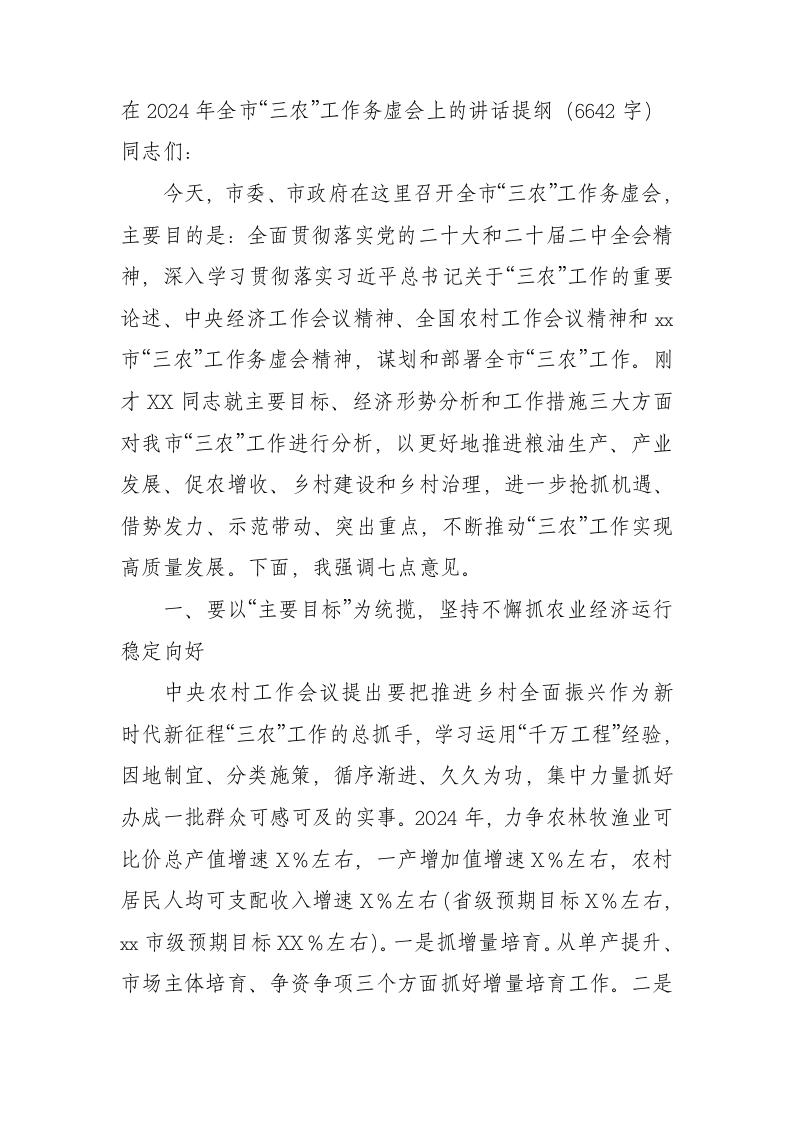 / 在2024年全市“三农”工作务虚会上的讲话提纲