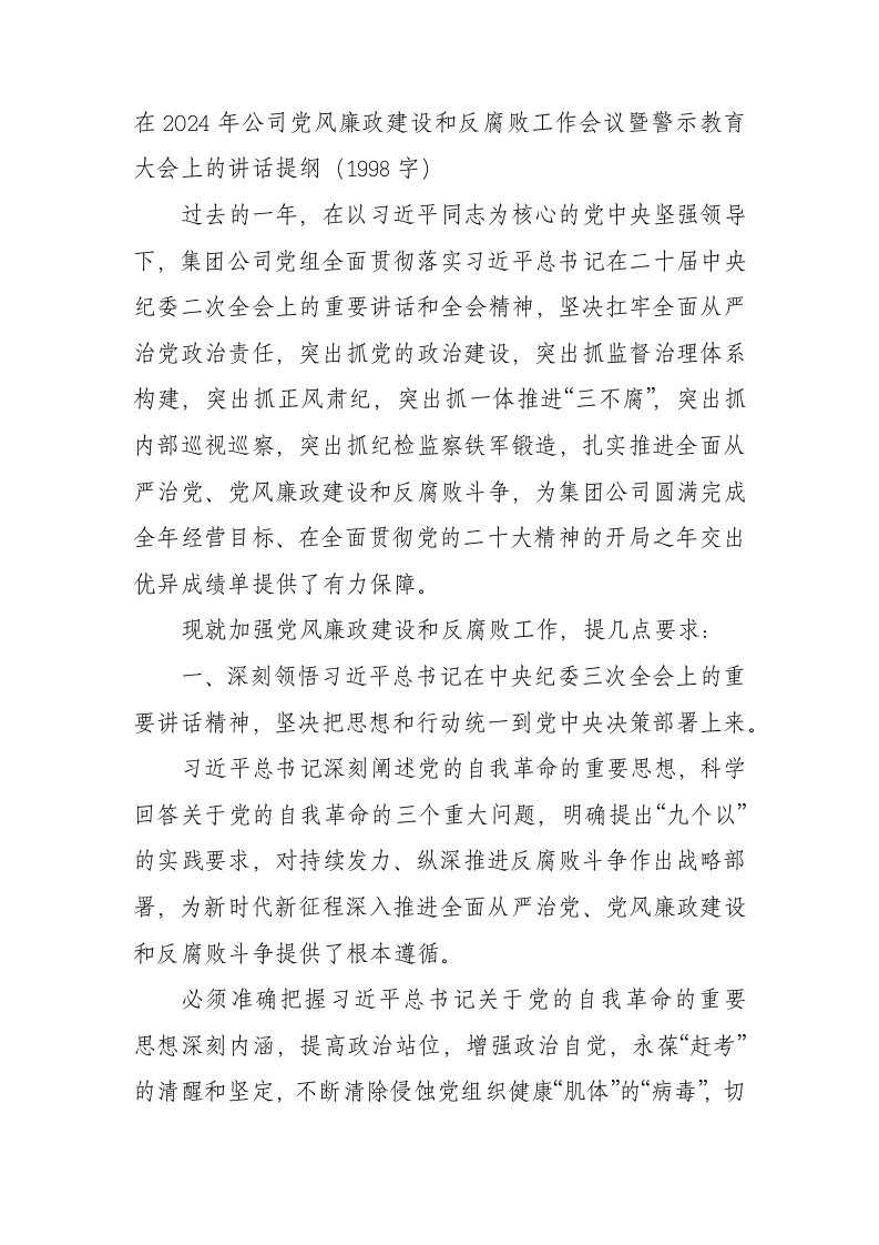/ 国企2024年党风廉政建设和反腐败工作会议暨警示教育大会上的讲话提纲