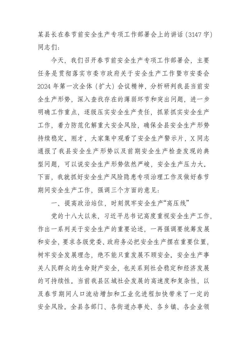/ 某县长在春节前安全生产专项工作部署会上的讲话