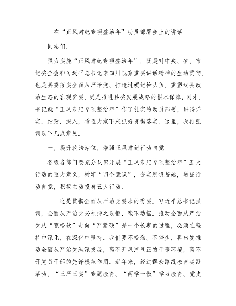 / 在“正风肃纪专项整治年”动员部署会上的讲话