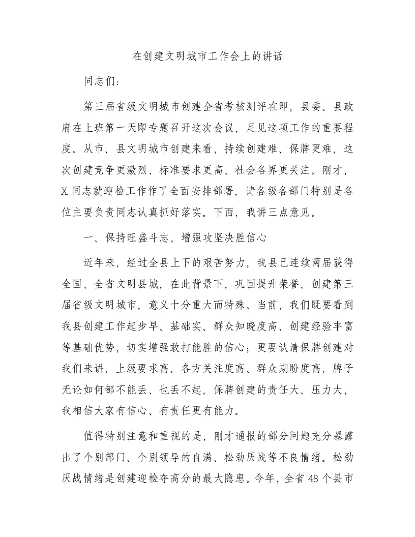 / 在创建文明城市工作会上的讲话