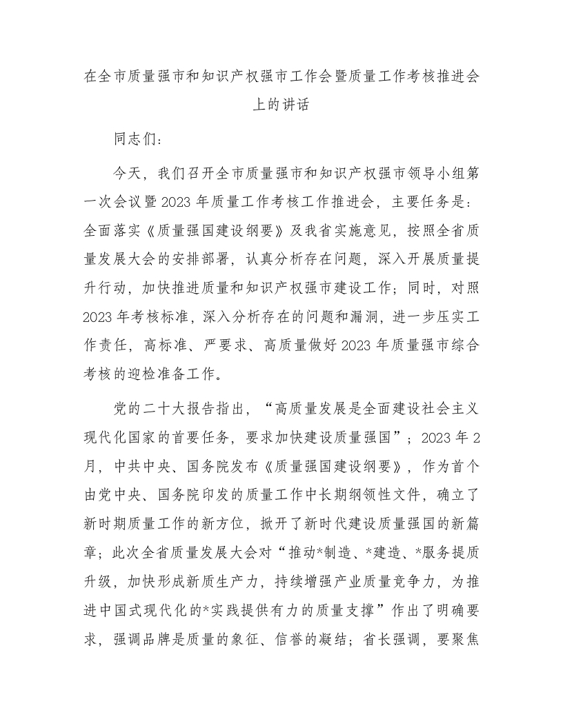 / 在全市质量强市和知识产权强市工作会暨质量工作考核推进会上的讲话