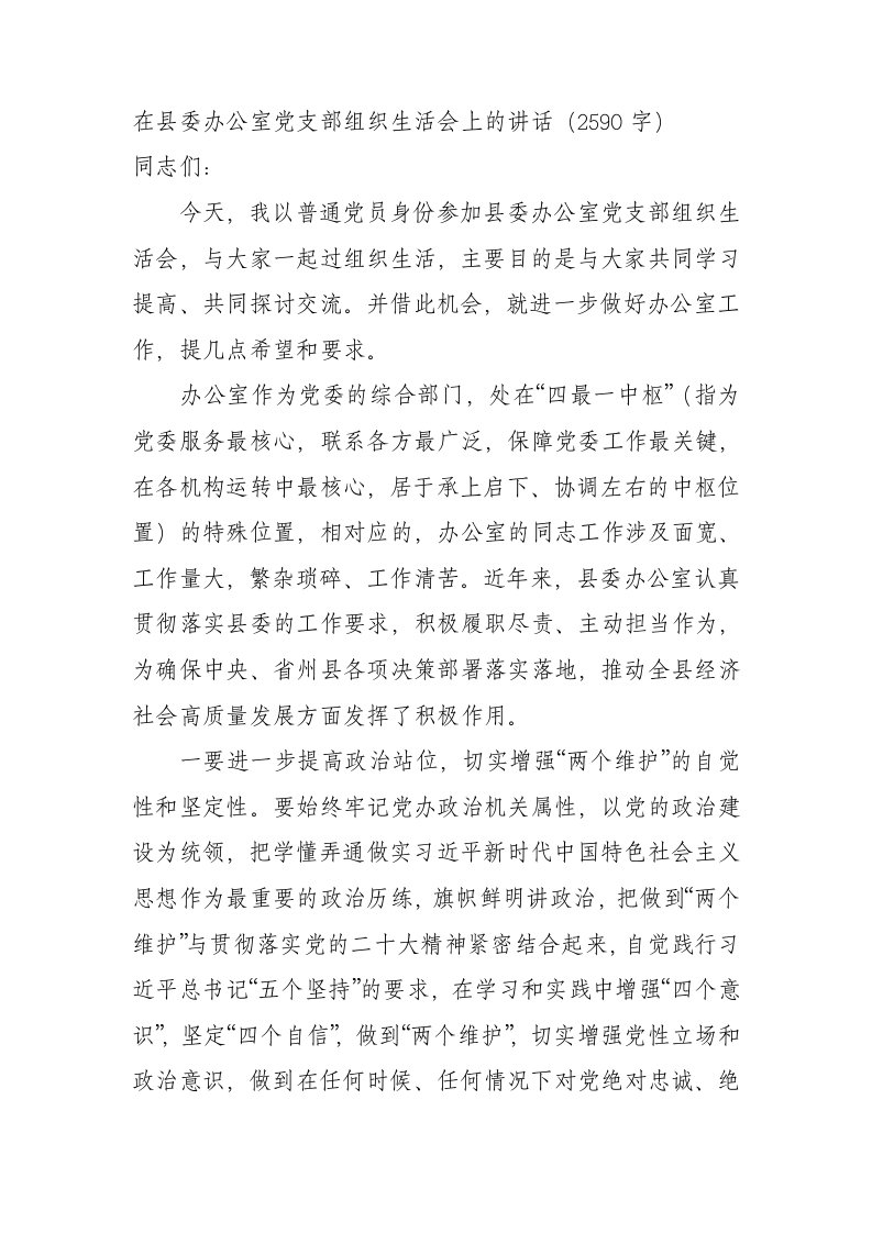 / (会中)县委书记在县委办公室党支部主题教育专题组织生活会上的讲话