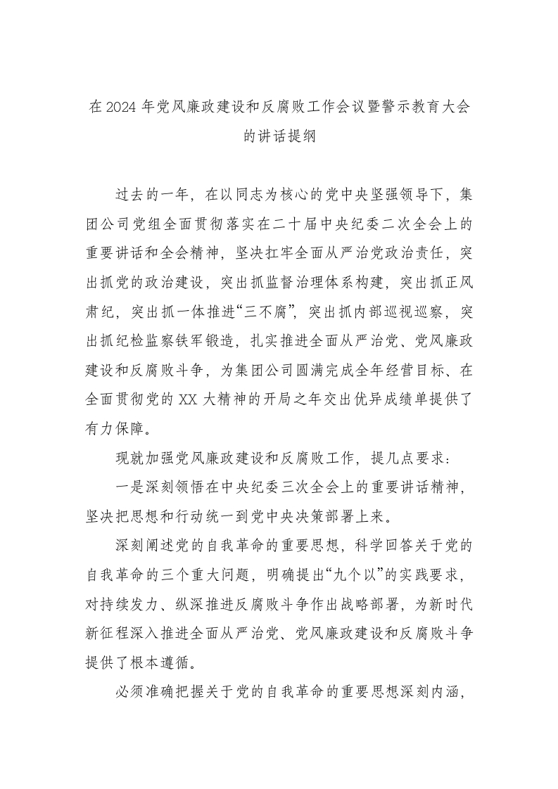 / 在2024年党风廉政建设和反腐败工作会议暨警示教育大会的讲话提纲