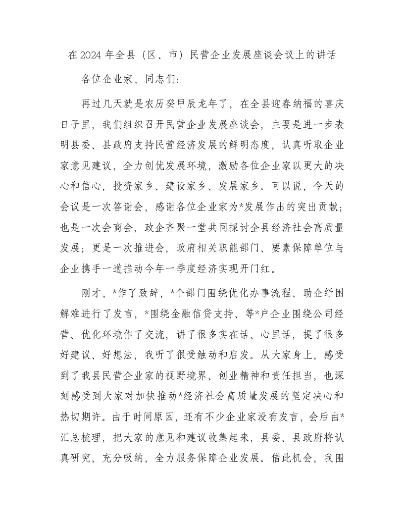 / 在2024年全县(区、市)民营企业发展座谈会议上的讲话