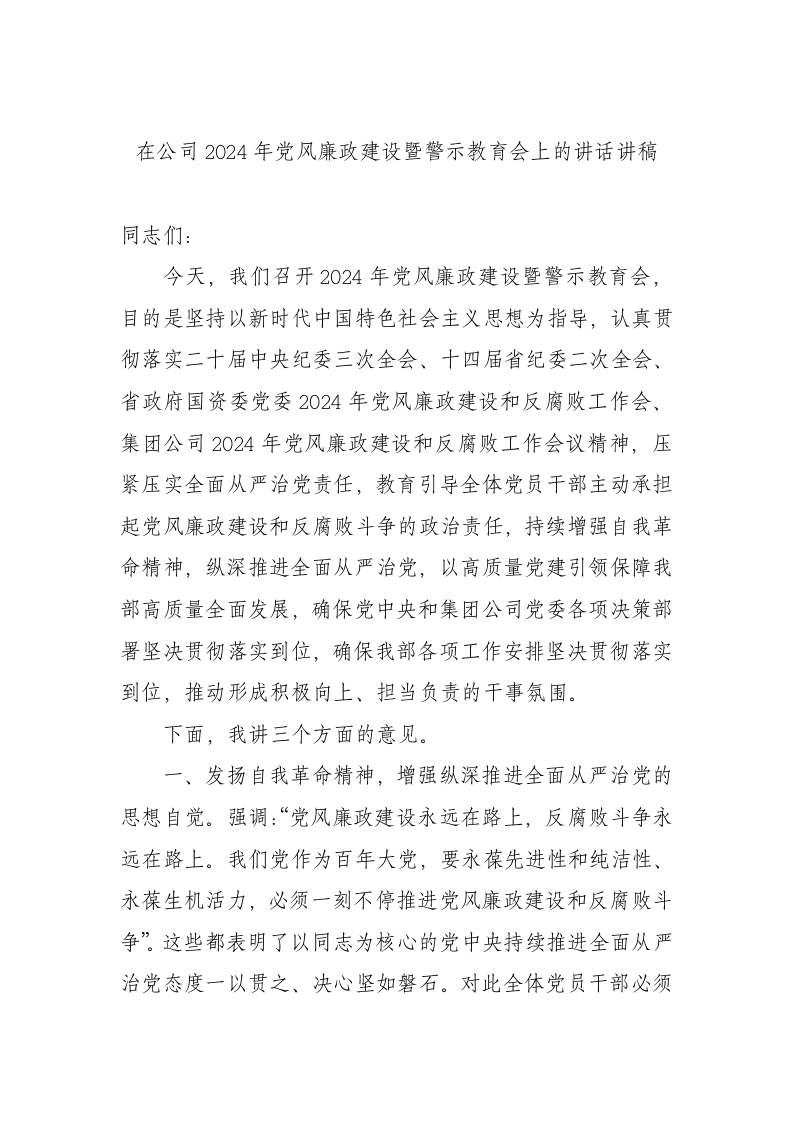 / 在公司2024年党风廉政建设暨警示教育会上的讲话讲稿
