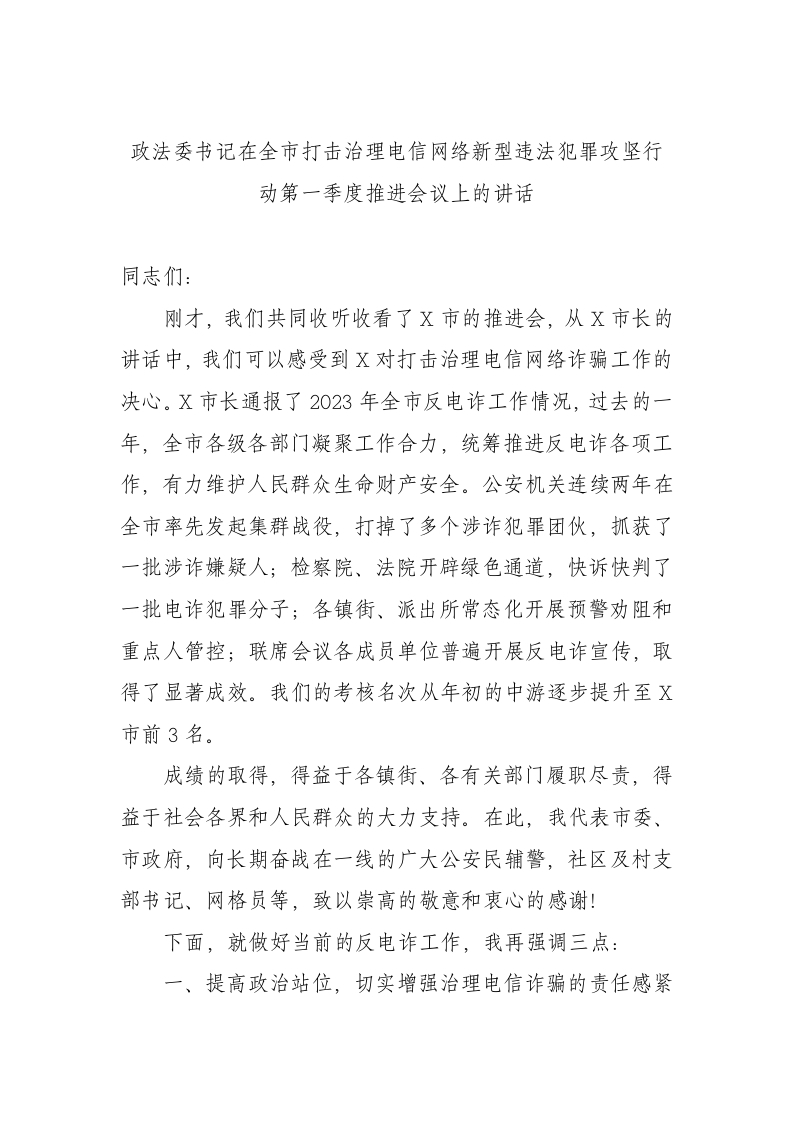 / 政法委书记在全市打击治理电信网络新型违法犯罪攻坚行动第一季度推进会议上的讲话