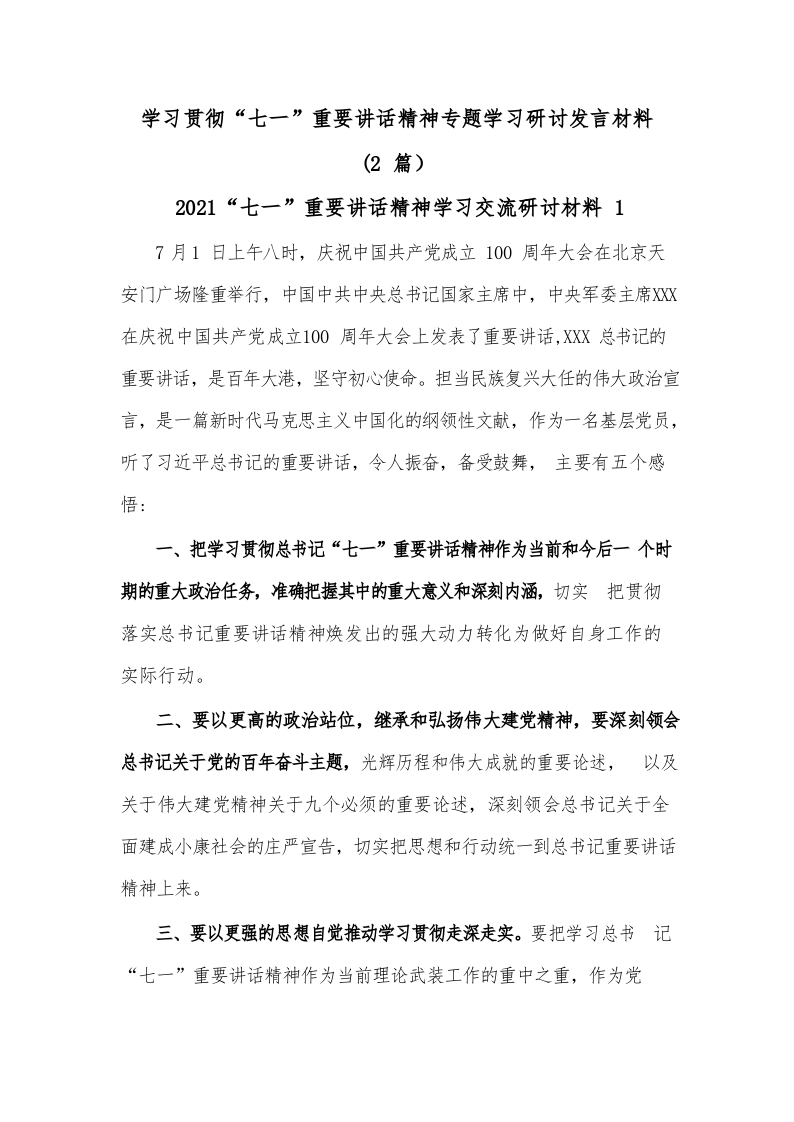 (2篇)学习贯彻“七一”重要讲话精神专题学习研讨发言材料