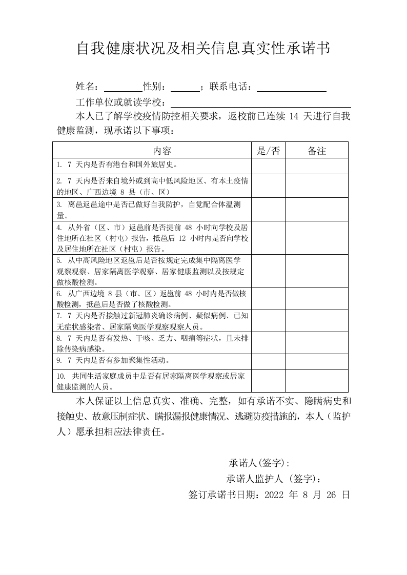 / (学生)自我健康状况及相关信息真实性承诺书
