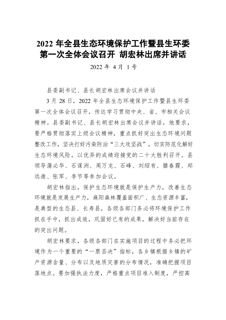 / 2022年全县生态环境保护工作暨县生环委第一次全体会议召开 胡宏林出席并讲话(20220401)