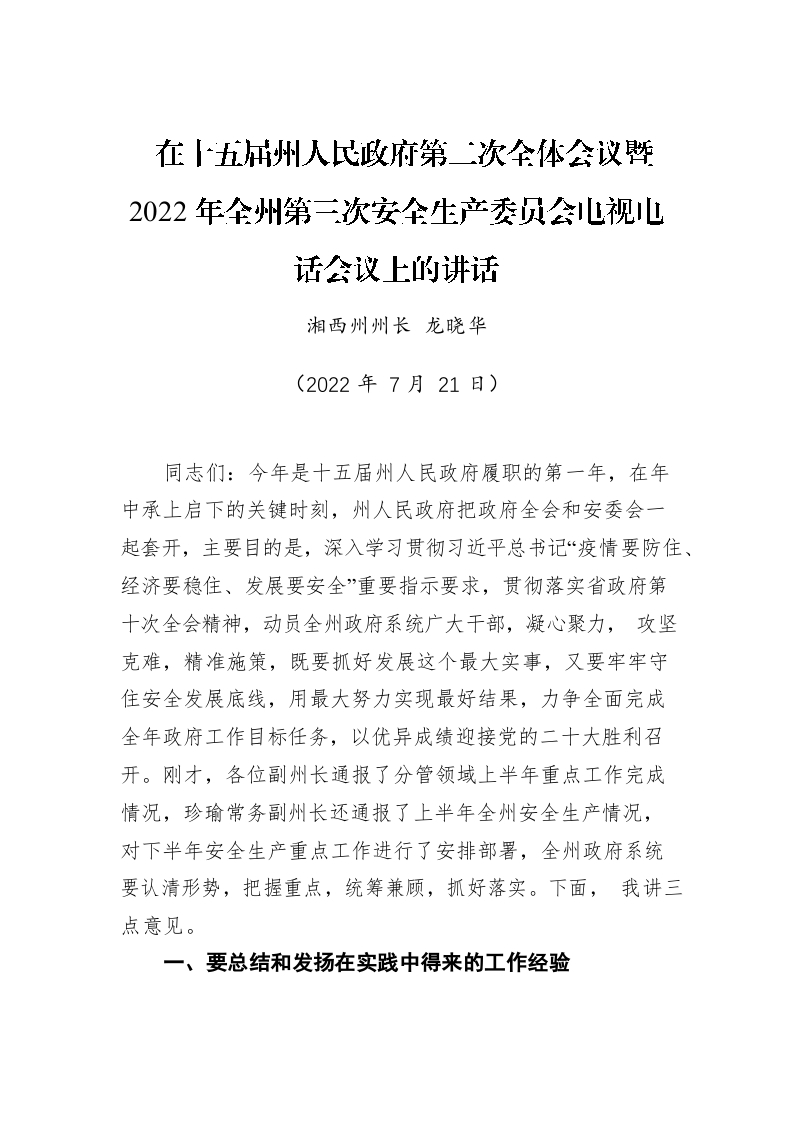/ 2022年全州第三次安全生产委员会电视电话会议上的讲话(20220721)