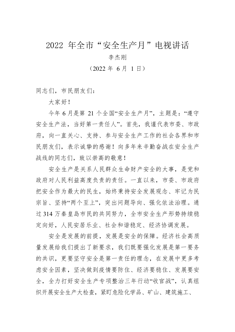 / 2022年全市“安全生产月”电视讲话(20220601)