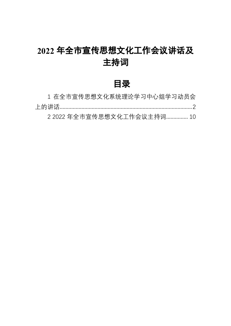 / 2022年全市宣传思想文化工作会议讲话及主持词