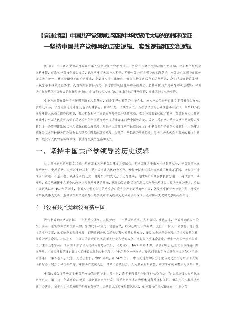 / 中国共产党领导是实现中华民族伟大复兴的根本保证——坚持中国共产党领导的历史逻辑、实践逻辑和政治逻辑