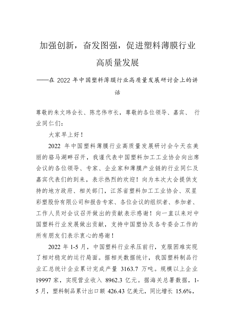 / 中国塑协王占杰理事长在2022年中国塑料薄膜行业高质量发展研讨会上的讲话(20220722)