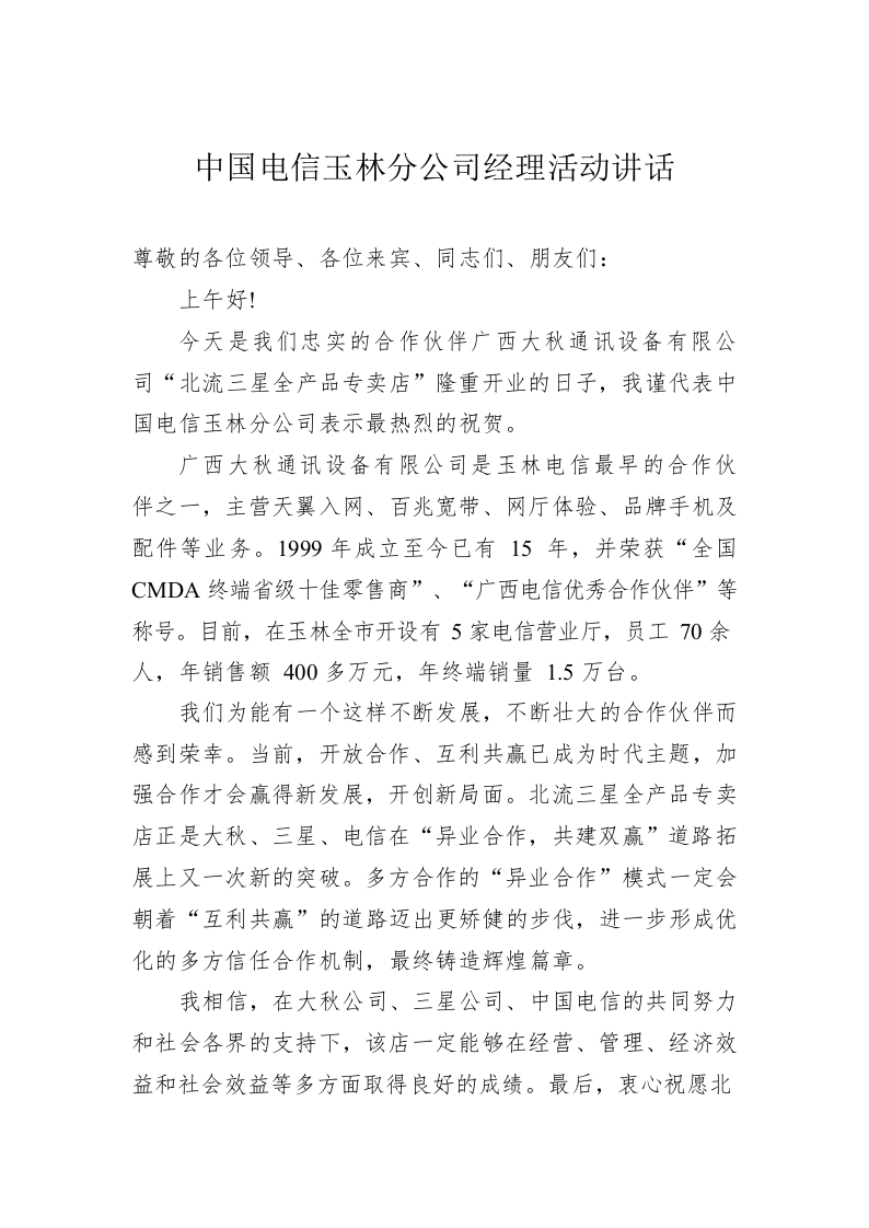 中国电信玉林分公司经理活动讲话