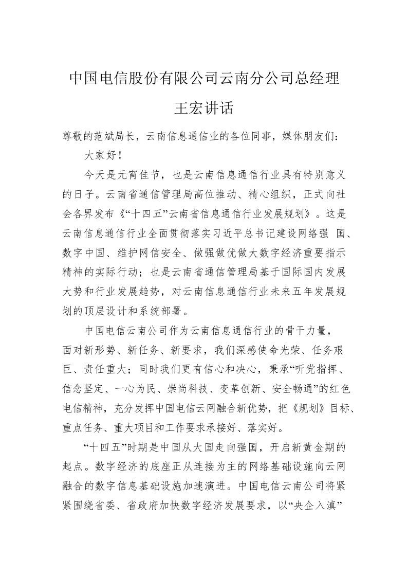 中国电信股份有限公司云南分公司总经理 王宏讲话(20220215)