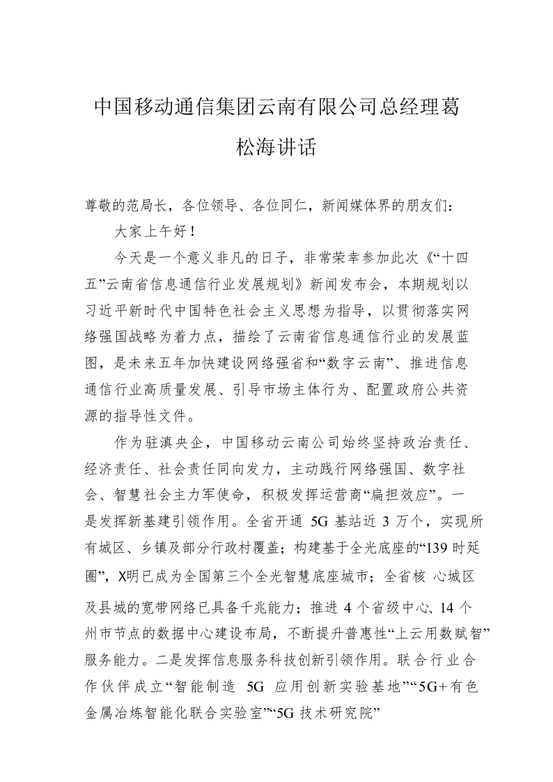 / 中国移动通信集团云南有限公司总经理葛松海讲话(20220215)