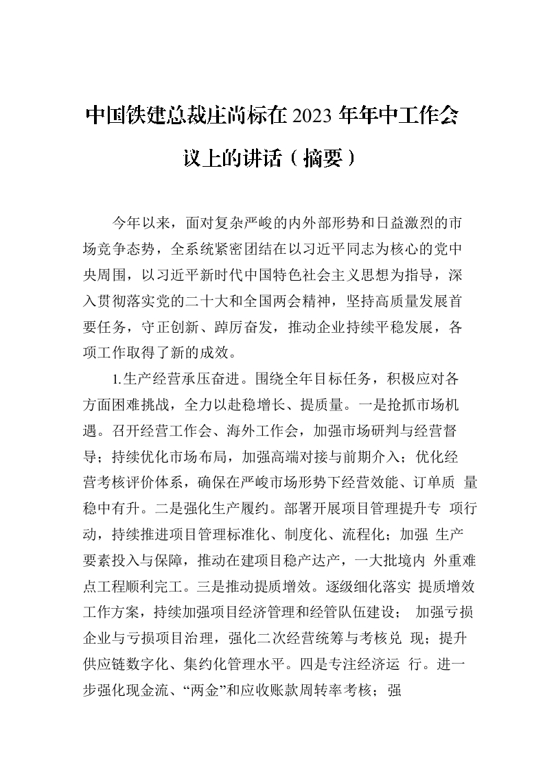 / 中国铁建总裁庄尚标在2023年年中工作会议上的讲话(摘要)