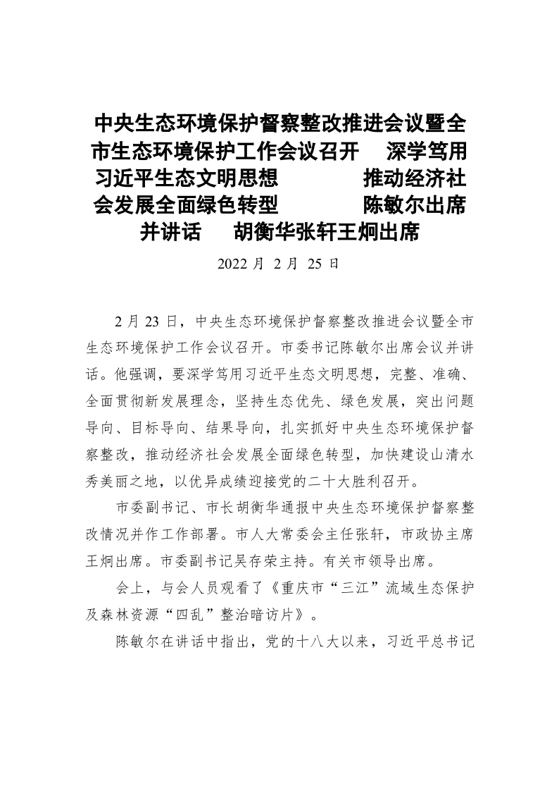 中央生态环境保护督察整改推进会议暨全市生态环境保护工作会议召开 深学笃用习近平生态文明思想 推动经济社会发展全面绿色转型 陈敏尔出席并讲话 胡衡华张轩王炯出席(20220205)