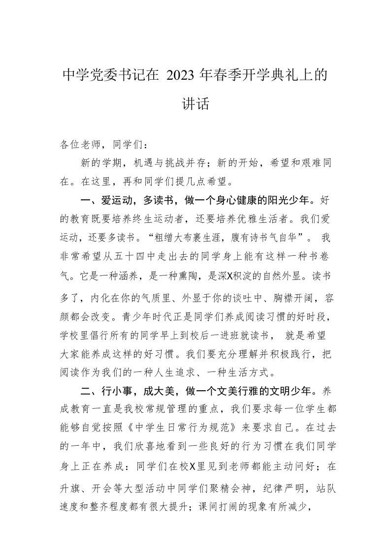 / 中学党委书记在2023年春季开学典礼上的讲话