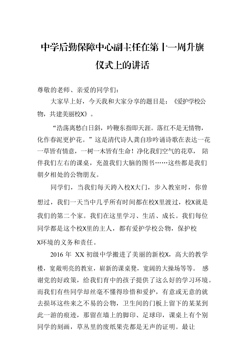 / 中学后勤保障中心副主任在第十一周升旗仪式上的讲话